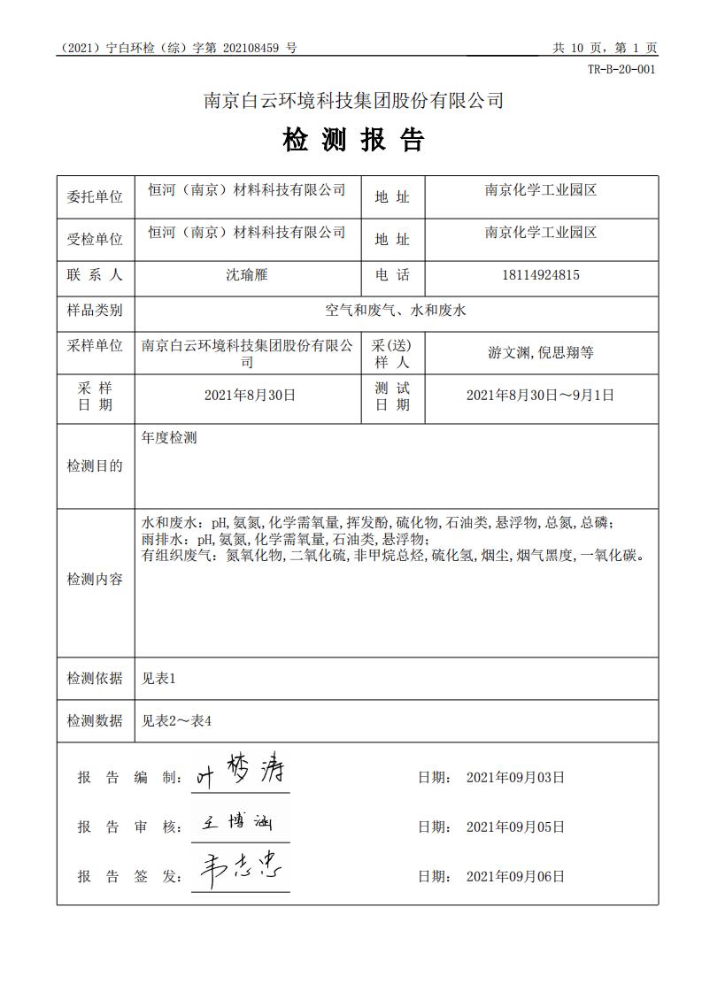 恒河(南京)材料科技有限公司2021年8月监测报告_恒河(南京)材料科技有限公司